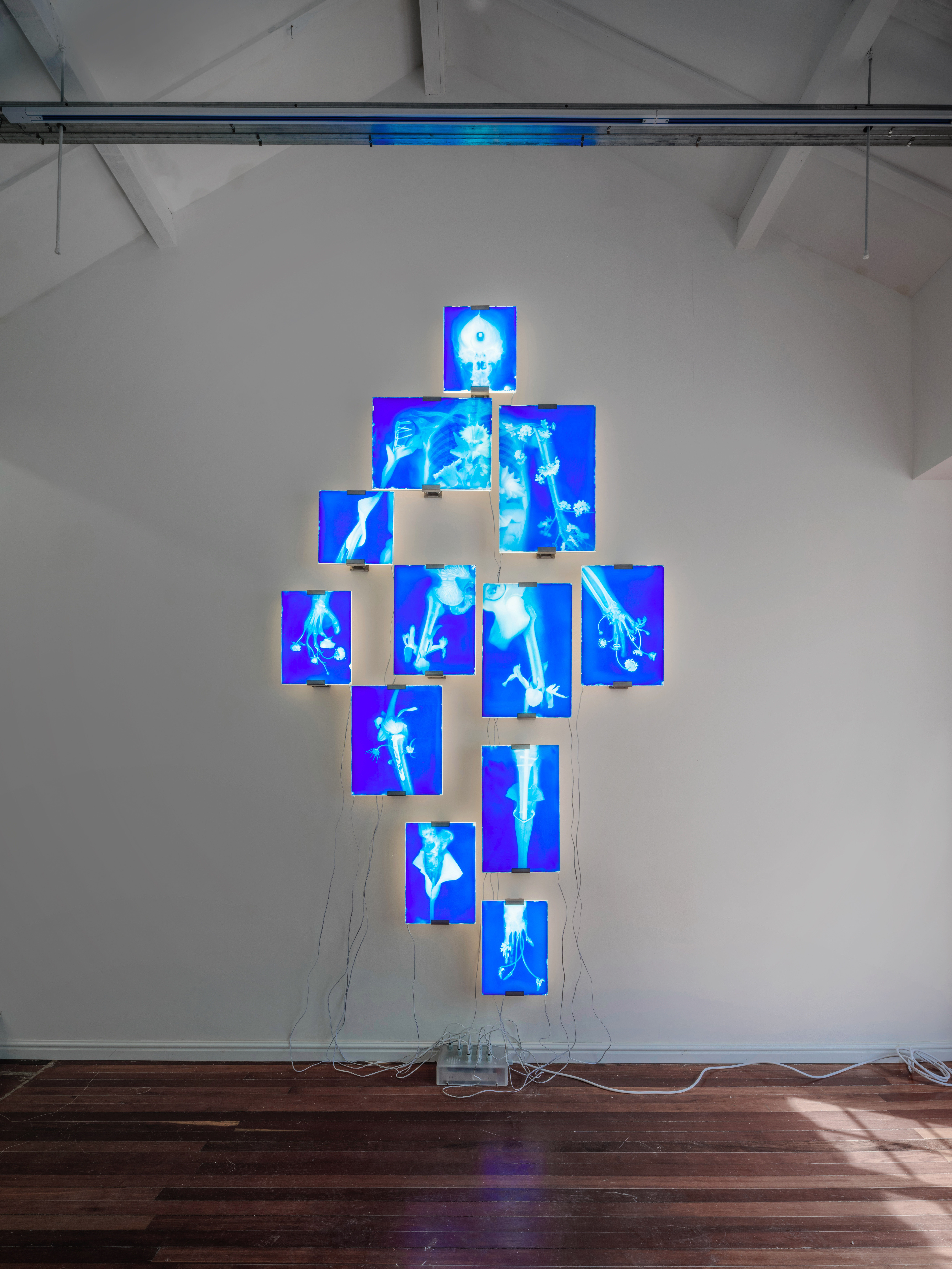 In Dream Body No.4, Weiyi Hu draws from X-ray images of injured body parts, merging them with botanical and floral motifs through cyanotype techniques. The resulting photographic installation proposes a "post-human" imagination that transcends gender and species. The work not only echoes the vanitas tradition and the Buddhist concept of "skeleton contemplation" (báigǔ guān) but also interrogates contemporary ecological philosophy, prompting reflection on interspecies symbiosis and the boundaries of life.