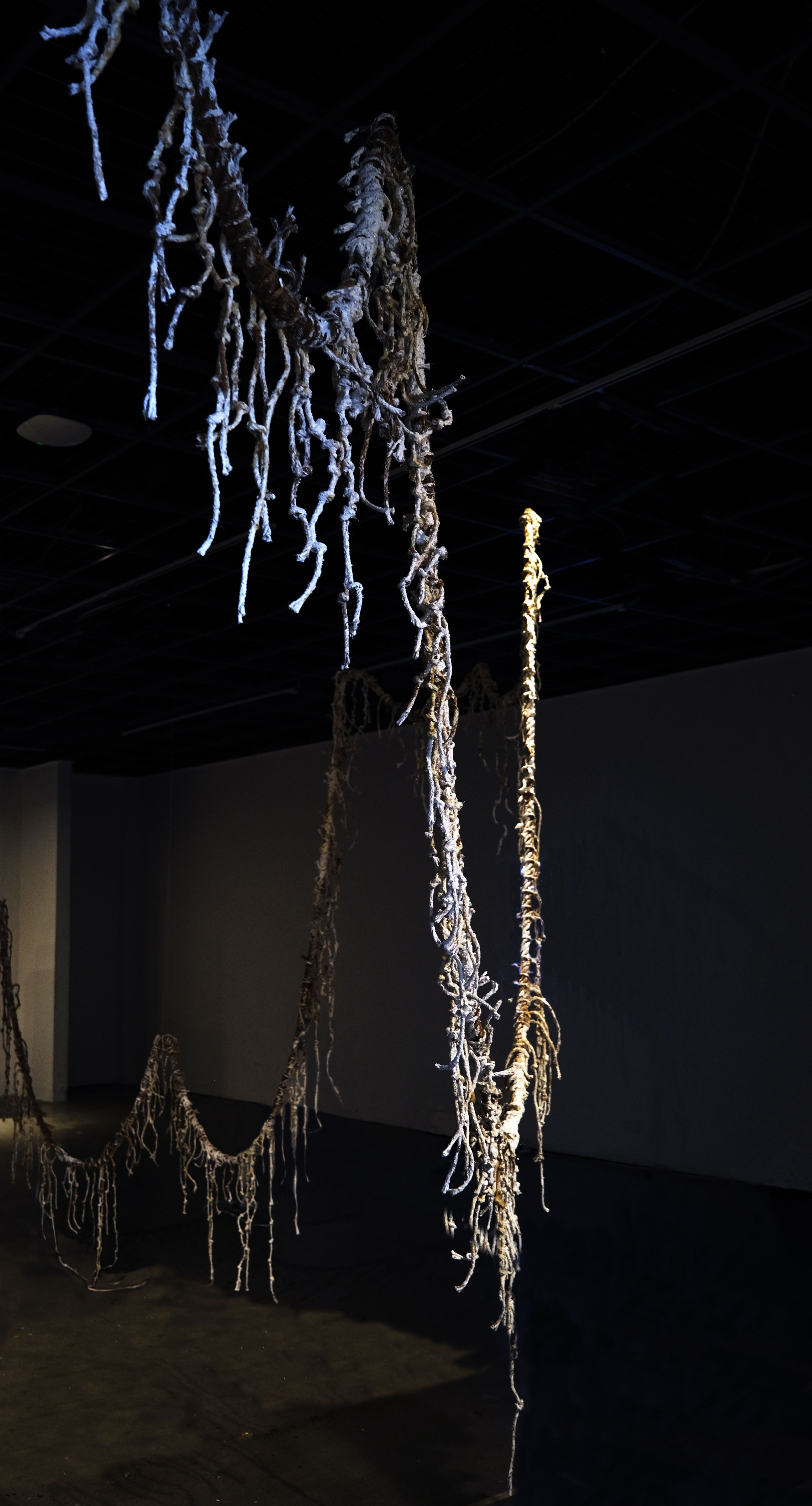 在刘玥拉姆 (Lhamo Yue Liu) 的装置作品《历史的症结》中,艺术家还原了阿拉斯加原住民的一种古老的符号记录系统——绳结记事。将1867年美国殖民者以每英亩两美分掠夺土地的史实,转化为电报码与绳结形态的拓扑学对话。这种古老的绳结体系有其特定的编码规则,平结、活结、死结构成流动的认知网络。在无文字的原始社会中,事实以与自然共生的方式被编织进物质的经纬,扭曲的绳结则揭露历史书写中被规训的褶皱。