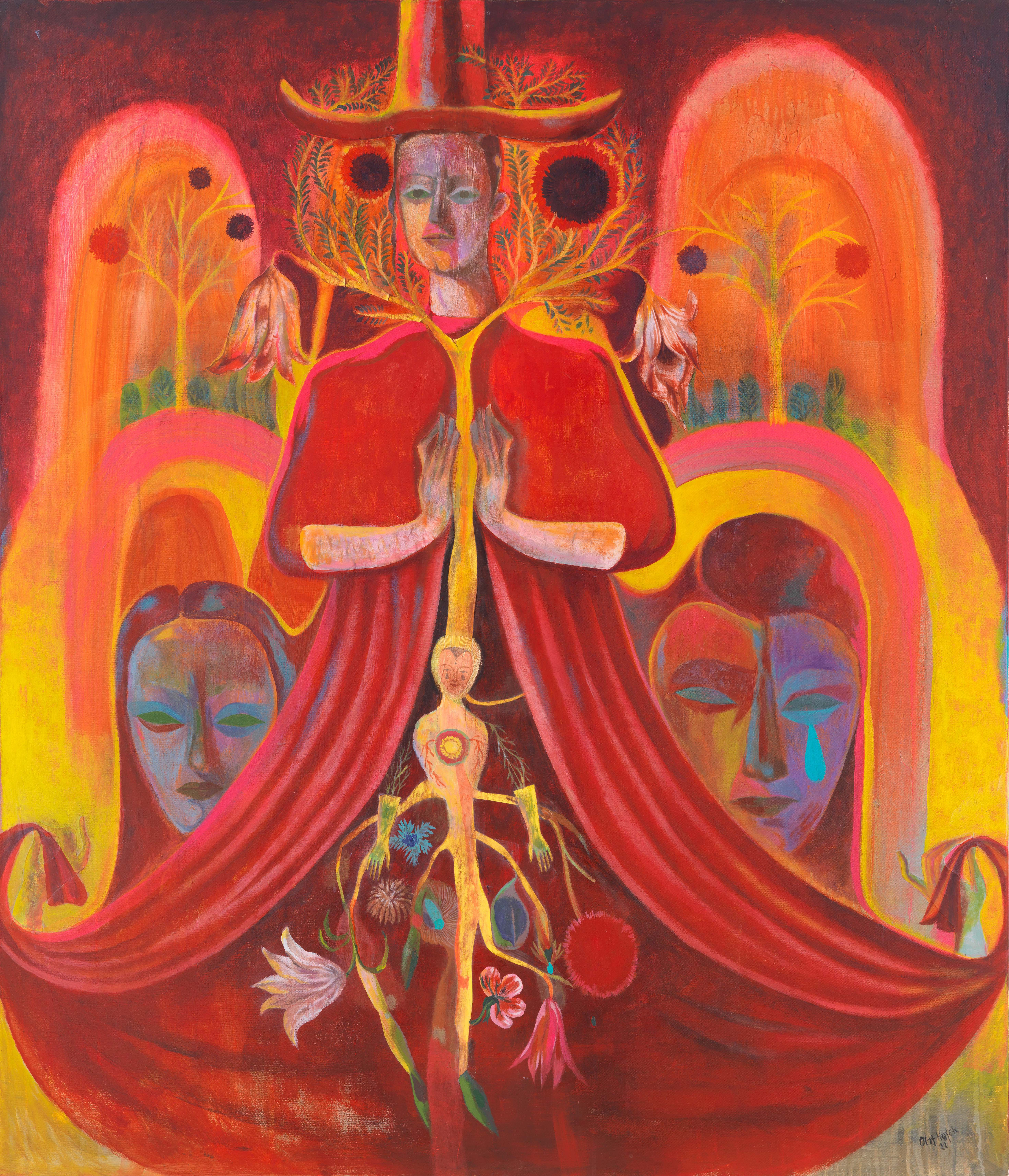周蒙 (Meng Zhou) 的绘画作品似乎回应着这一问题。艺术家以自己的梦境结合神话隐喻,抽象化了人与环境之间纠缠与共生的关系。在他的绘画中,人的主体被放置在不同的时间与空间的尺度之内,人与自然不再被割裂为启蒙理性建构的二元论研究对象,而似乎存在着人-神-自然的契约秩序。