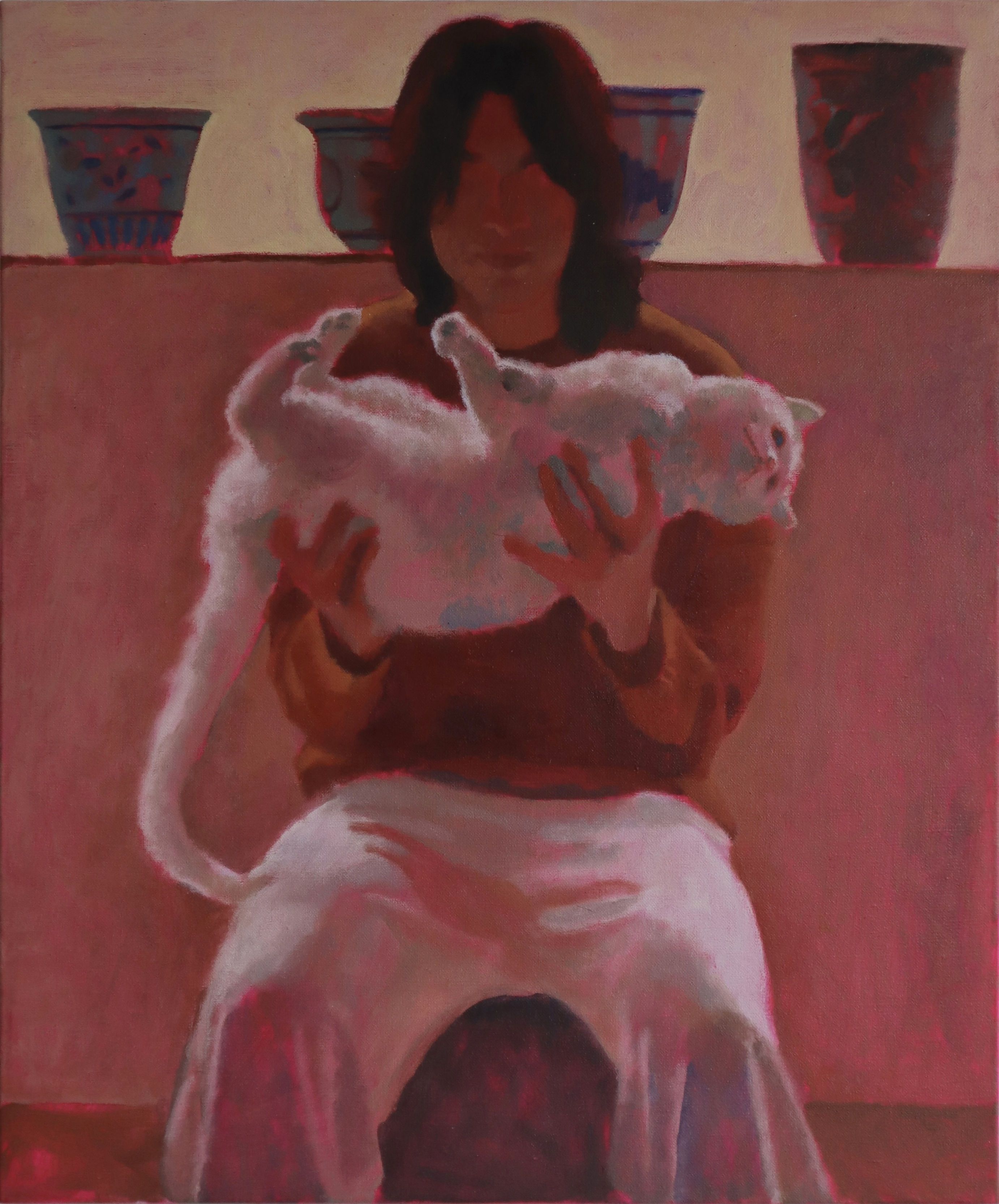 In Killion Huang's paintings, the artist places semi-nude men (along with cats) in cramped and intricate indoor scenes. Moreover, these red artworks strive to present transitional, transformative, or dazzling visual effects in their details and partial views. The scenes depicted are narrow in scope, allowing viewers to imagine themselves in such scenarios: sharing a room with a man playing with a cat. These paintings possess a non-violent characteristic—both in brushwork and theme—while also displaying a blurred boundary between a man's 'self-shaping' and 'self-care.' This significance is portrayed in the artwork 'Ceremony' (2024): the figure in the painting holding the cat's hands aloft simultaneously conveys a sense of shaping and protection.