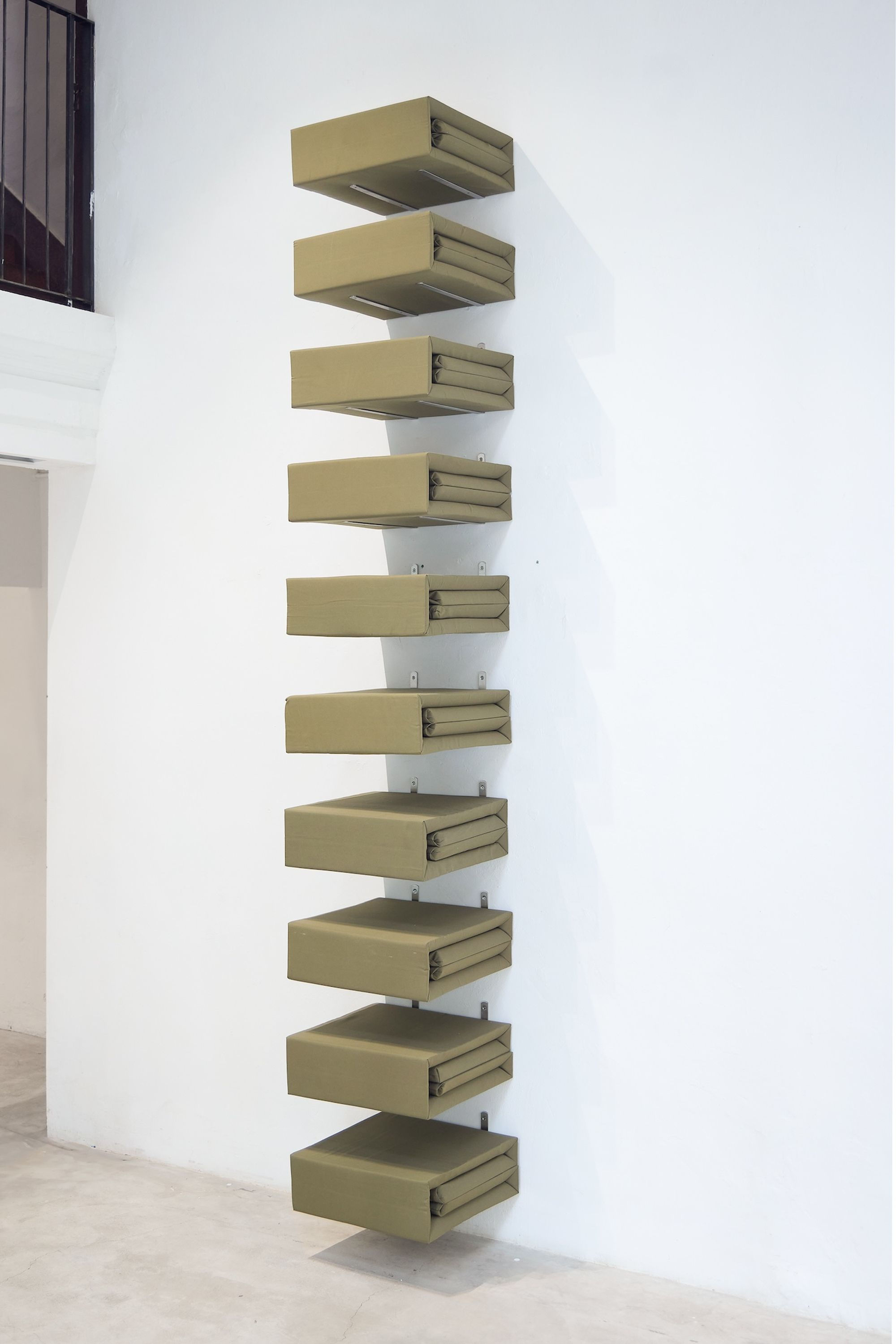 The symbolic green color is continued in the second floor, introducing viewers to the classrooms that our generation remembers, with dark green walls evoking childhood memories. Another installation by Julian Junyuan Feng, Judd in Uniform pays homage to Donald Judd. The tofu block shaped military green quilt symbolizes the tough transformation of soft materials, a metaphor for a sense of obedience and order. This symbolism is particularly salient in our cultural context, where personal growth often means smoothing out the edges and achieving a certain “roundness”. The two form an interesting dichotomy in the honing of the individual's will.