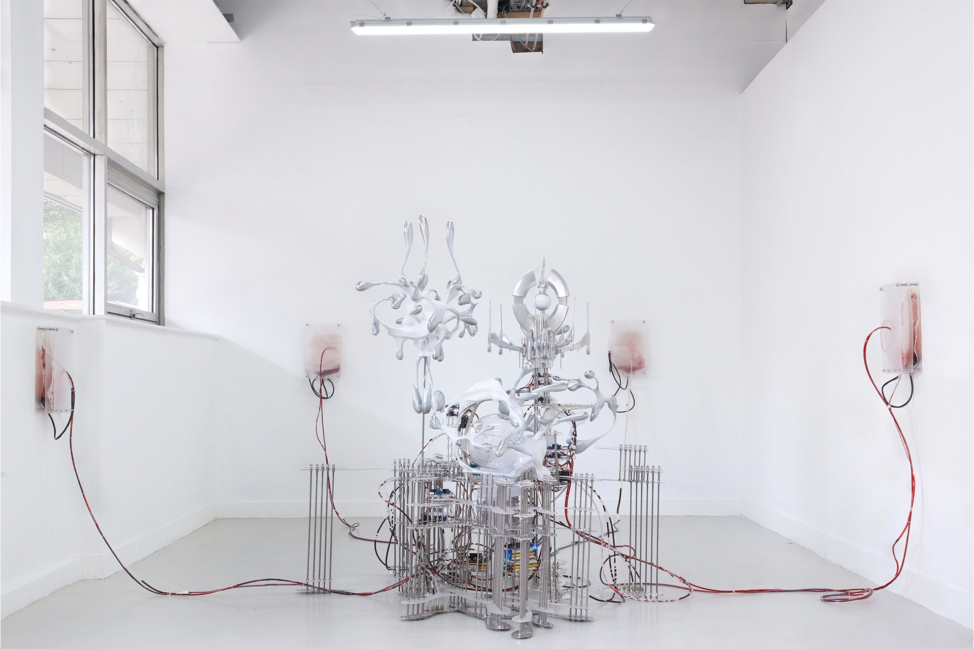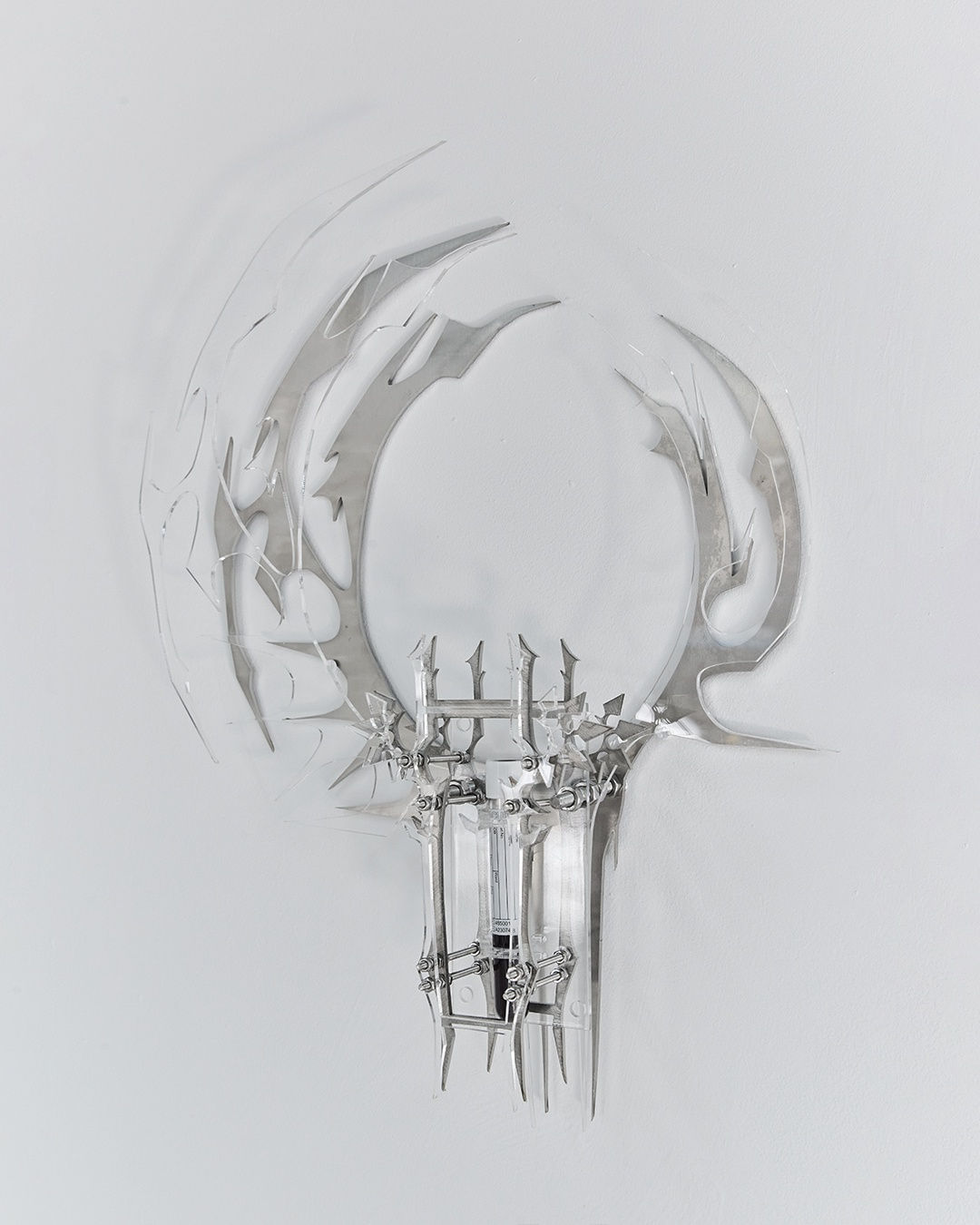 00 Zhang weaves her cultural background and international living experience into her work through a futuristic artistic language. Her large-scale installation Reverse Prototype 0033 (2024) presents a complex cycle of mechanised, organism-like sculptures. In this immense and sophisticated work, a liquid simulating blood flows between various parts, symbolising the transfer of the individual and life force between virtual and real space, and the boundary between individuals and greater systems. It not only explores the role of the individual as a part of the system, but also reflects on migration, population movement, and the fluidity and borderlessness of cultures. 00 Zhang admits that this work, which took nearly a year to create, is not only captures her personal state at various times, but also a response to the conflict of cultural identities that she has experienced in the context of globalisation. At the same time, Amber Xiangning Lu reinterprets objects and materials to incorporate her personal history into her works. In Can't Be Taken Along (2024), Lu cleverly intersperses auricles between beaded curtains, putting forward the paradox of memories that are attached to the body but cannot really be taken away. Lu explains that this work is a metaphor for family histories - those that could not be taken with us are what define our sense of belonging.