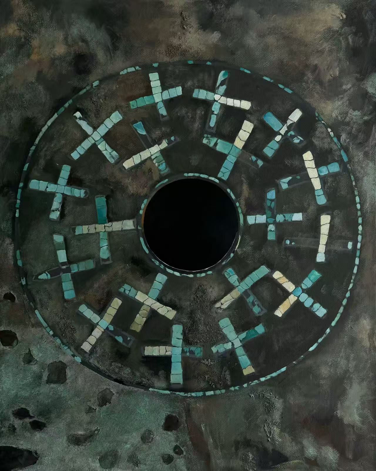In the works presented in this exhibition, a series of pieces such as "DarkRed3200" and "Turquoise3600" meticulously depict the surfaces of copper artifacts, creating an intriguing dialogue with the ancient relics housed at the Aurora Museum. The numbers in the titles mark the years since the creation of these objects, reflecting the rust marks that also hint at their age. The rust, in different hues, grows in a steady, deliberate manner, much like a brand or a marker of the object's age and history. However, this proof of identity is not stable. It is continuously shifting and evolving, just as time flows and human society transforms, ultimately falling within the cycle of perpetual change.