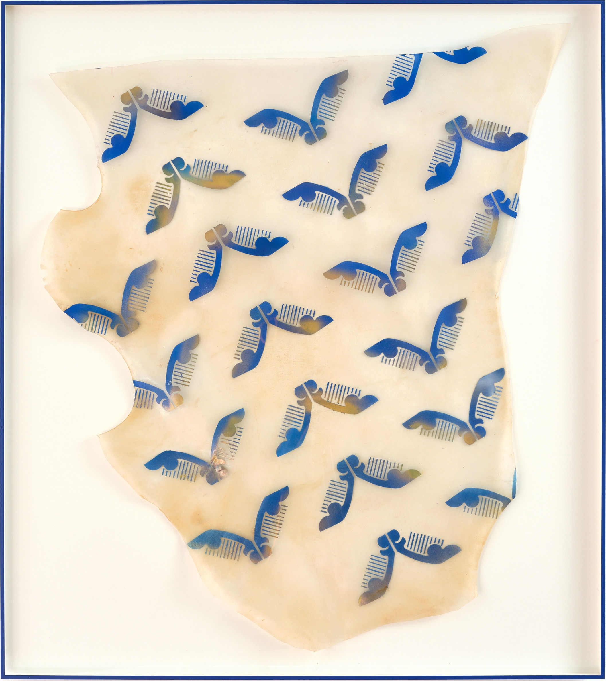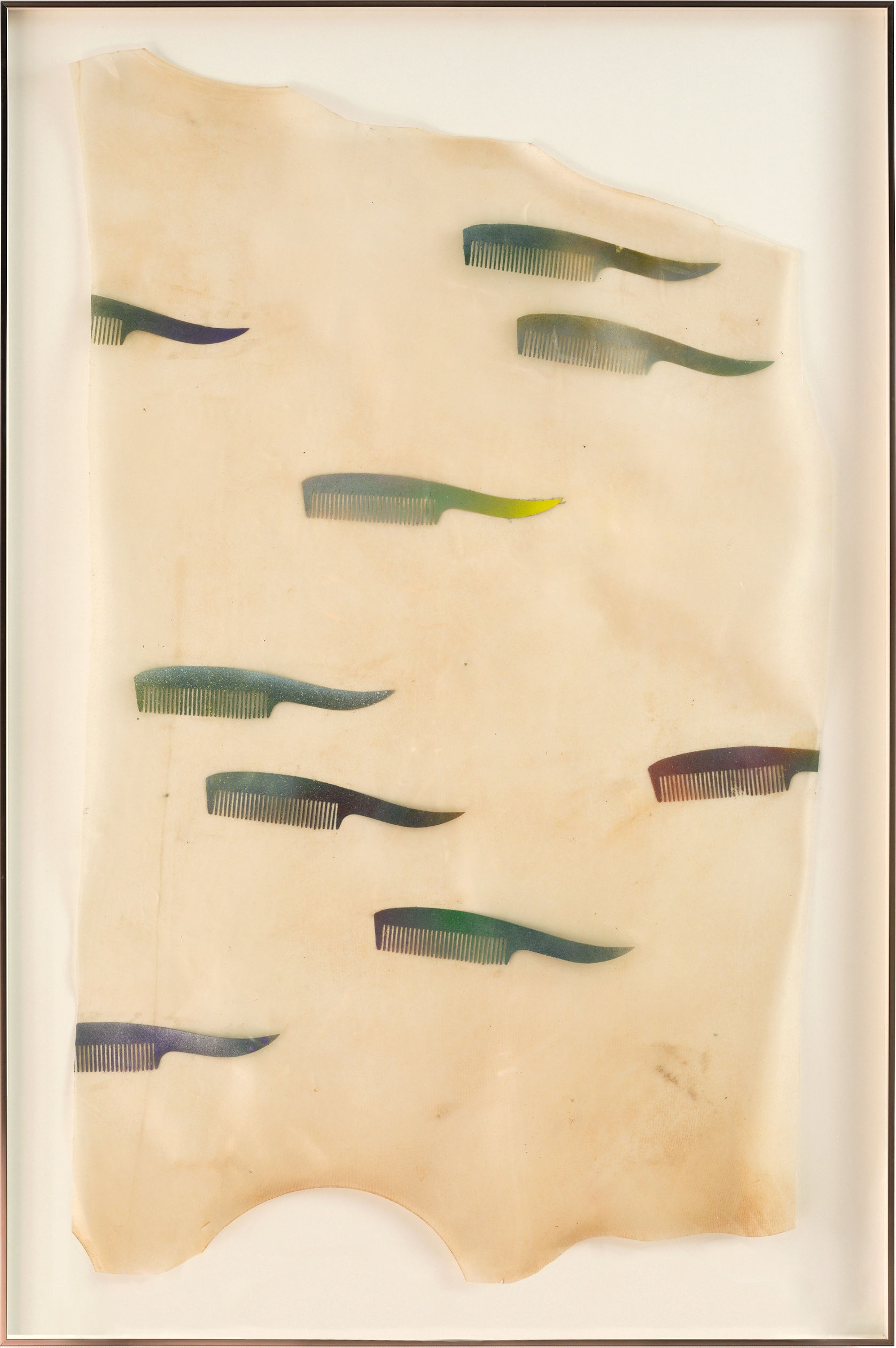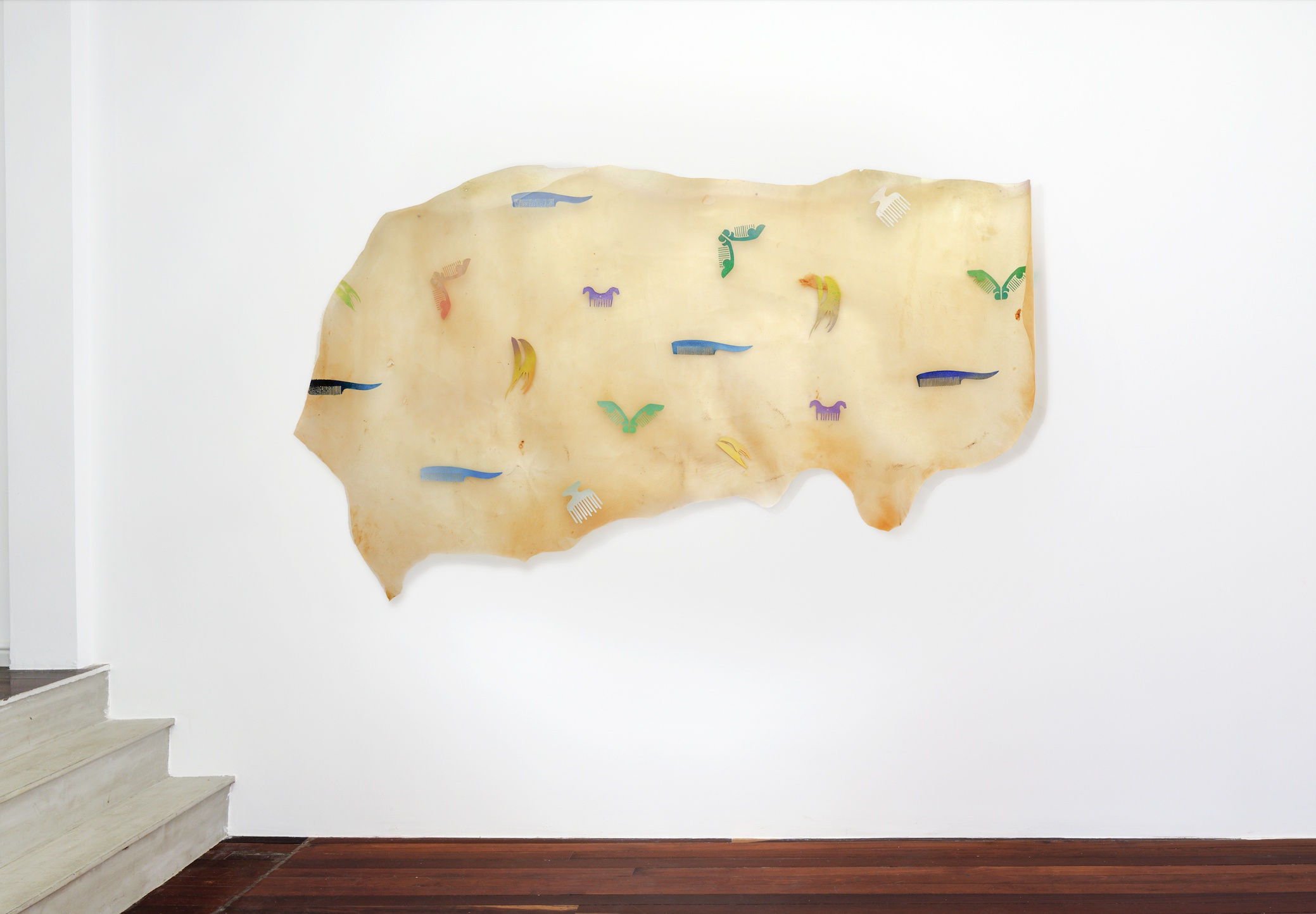 The works on the shelves continue in this vein. The artist has painted various comb shapes on translucent cowhide. The different forms of combs from ancient times to the present day are displayed to express the long history of hair order. The exquisite and regular printed pattern contrasts strongly with the original cowhide, highlighting the dislocation between the exterior decoration and the original body.