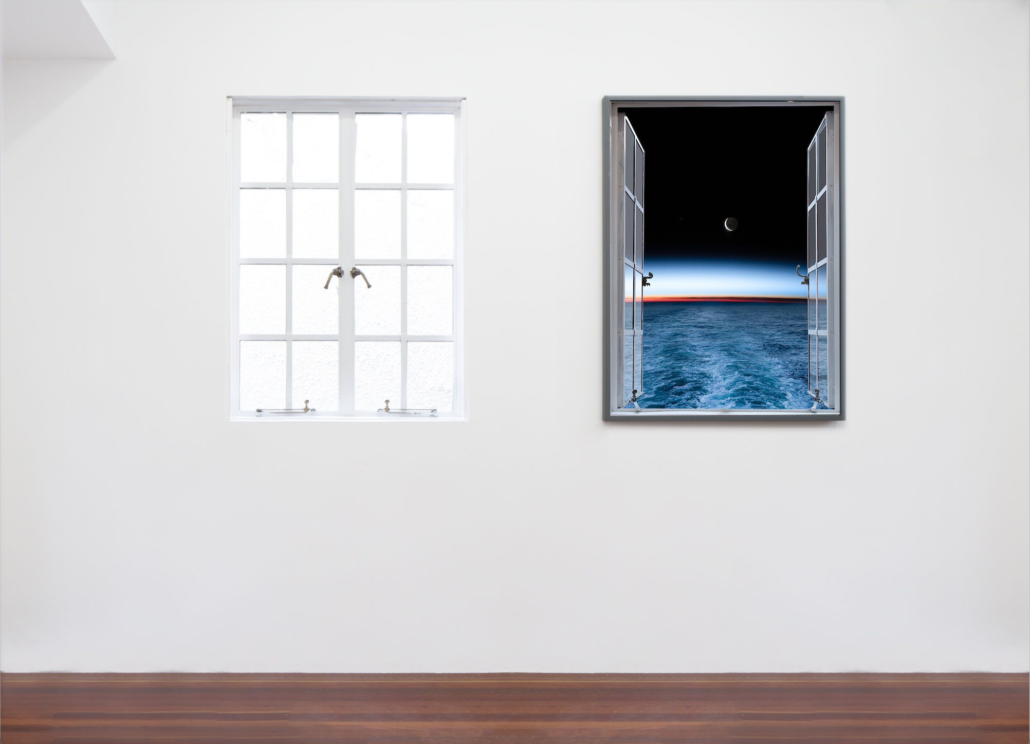 The photographs by the window on the other side reproduce the "sinking" of the episode narrated by the voice, with the moon suggesting the tides and the desire for natural rhythms. The water below is the wake of a ship that the artist photographed while traveling in Iceland on a boat to a smaller island. The search for a deeper end beyond the end of the world seems to suggest a true "escape".