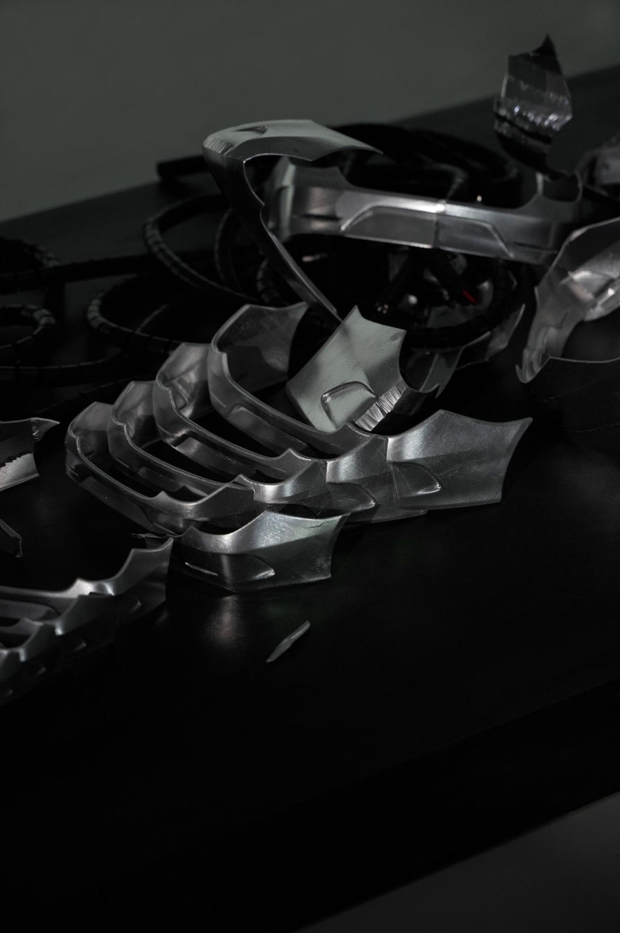 The work resembles the wreckage of a car crash, mimicking the self-amputation of a threatened reptile. Post-body abandonment, the skeleton continues its stubborn resistance, with the violent collision marking the grand finale of the struggle. Despite the clash and partial sacrifice of the self, masculinity remains intricately woven into every remnant, with even the act of resistance celebrated as a masculine fight. At this juncture, the lingering soundscape resembles a dirge, mourning not the catastrophe itself but the helpless pain and confusion that persist despite the battle.