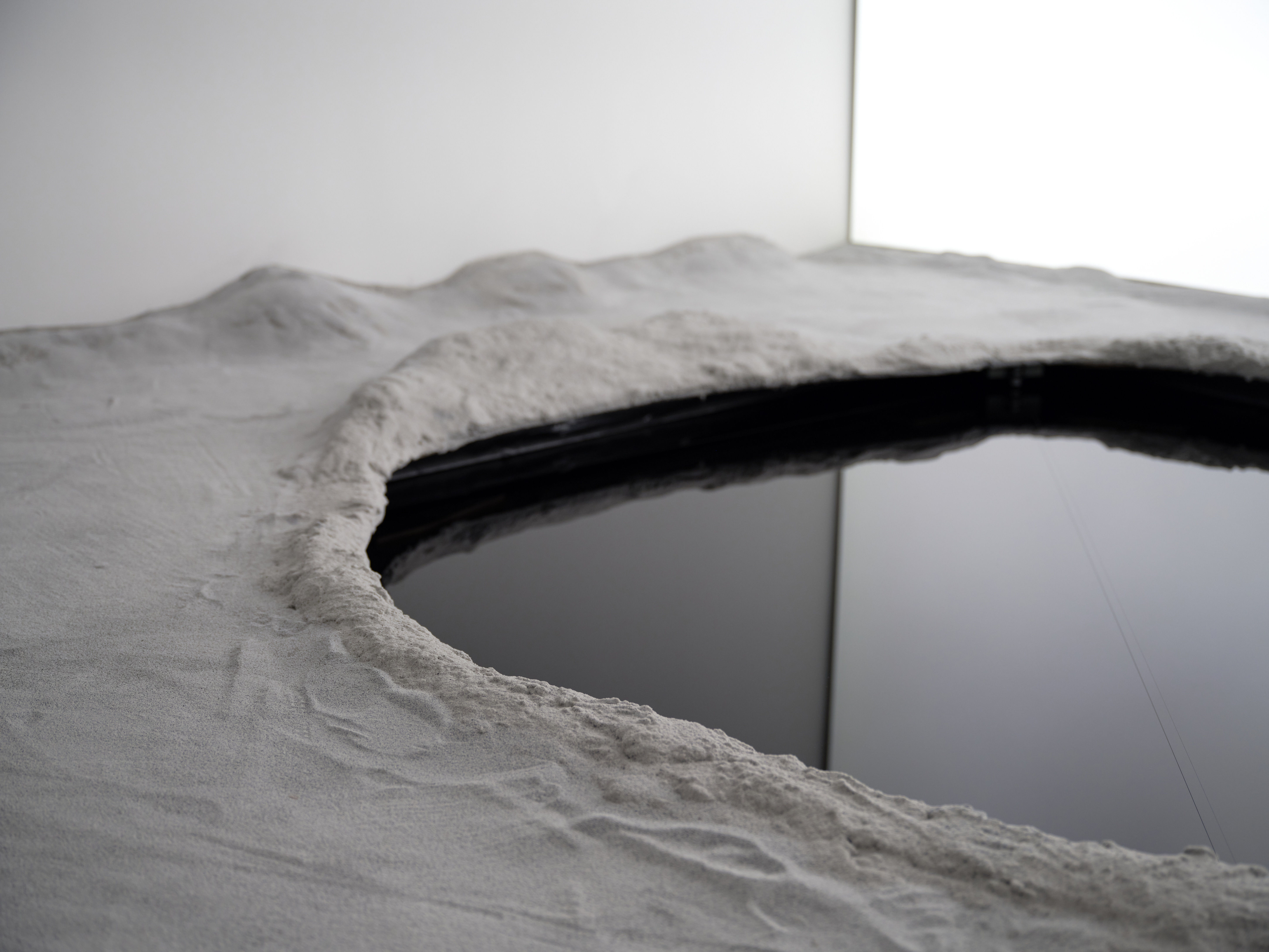 On the third floor, the large-scale installation "Disturbance" (2024) forms a meticulously considered, complete "poem." An entire wall is transformed into a gentle light source, reminiscent of the traditional aesthetic of "words end but meaning is infinite," with a vast area of blank space. The snowy landscape piled on the floor and the naturally formed black water pools evoke the tranquility and infinity of a Zen garden. However, the traditional rake is transformed into the artist's signature material—line segments, continuously carving ephemeral yet perpetual traces in the water.
