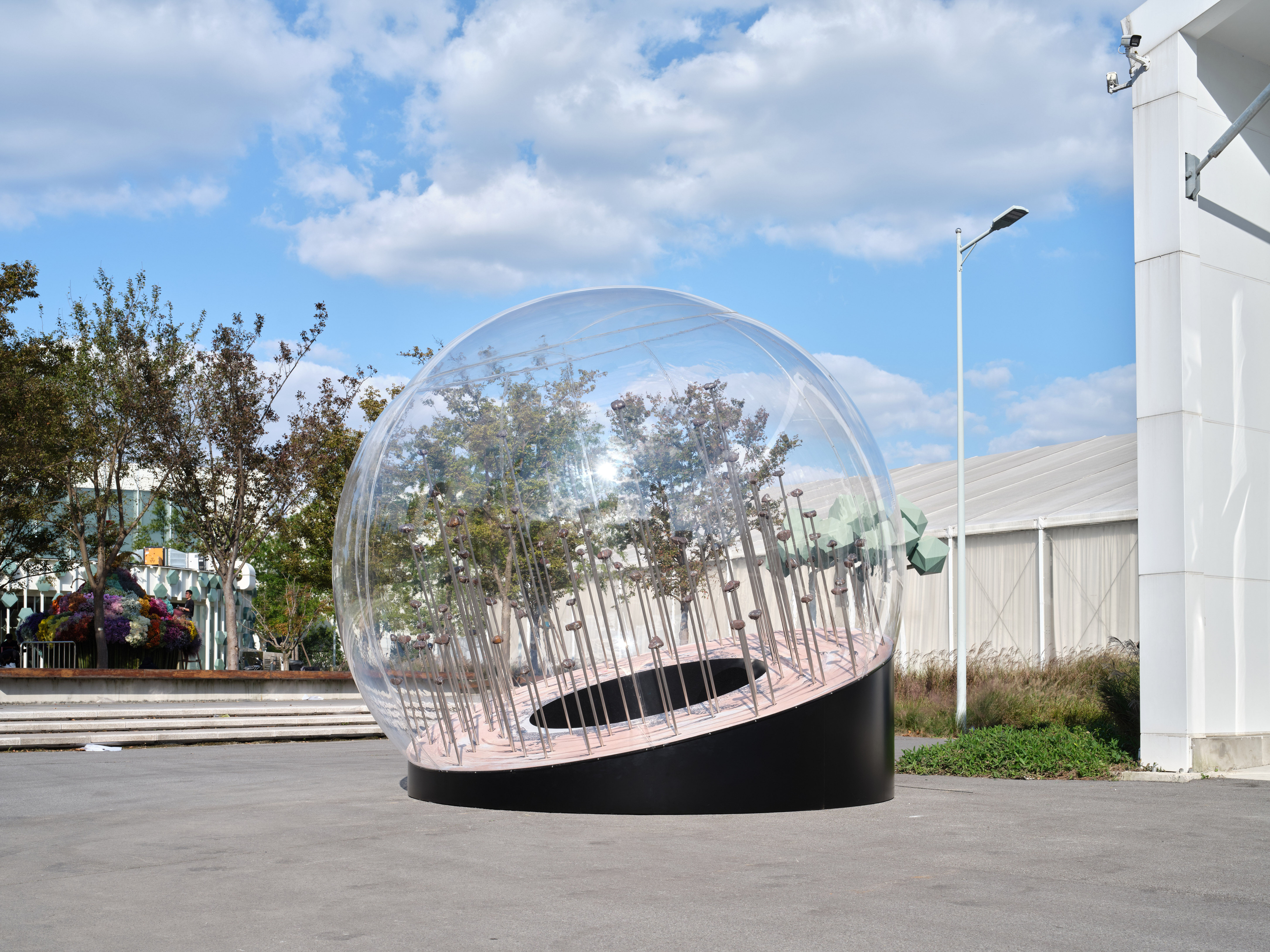 On the ramp of the public installation in the DREAM xiàn chăng section, Meng enlarged one of his iconic paintings, “Move for This”. The work seems to place ancient cave murals depicting deities in a giant crystal ball, with totems of the 88 constellations embedded in meteors frozen in mid-air. Transparency and solitude, as the stone turns to flame, becomes light and dust, subtly changing the world, erasing lines and years - forming the bedrock of life. As it falls, fragments of the universe infuse the earth, time and space mingle in collision, and man and the stars dance together in this moment.