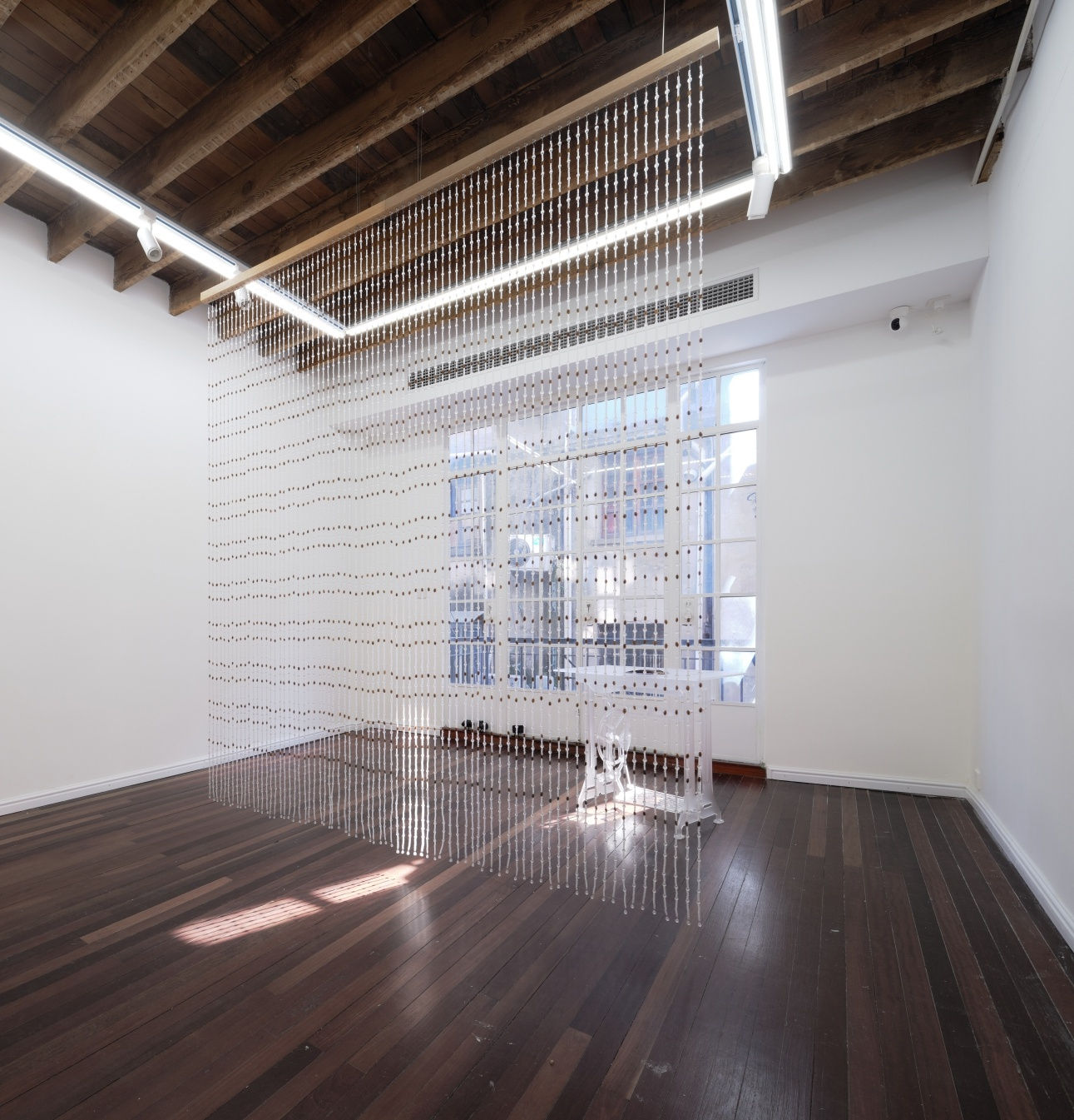 Amber Xiangning Lu's work is on display in the exhibition “rooted, yet flowing” at Nan Ke Gallery. Her works are composed of different media such as painting, sound and installation, Interwoven into the narrative of the gallery's last-century space is a field of ghost-like memories.The works in this exhibition focus on the artist's interest in psychological space and her expression of the coexistence of different temporal dimensions in the same physical space. She re-observes the past from the perspective of the future and unearths the subtle, eerie and unsettling atmosphere of childhood memories. The translucent material seems to be the “ghost” of the object, while in contrast, the old wood shows the traces of the user's history, a “relic” type of existence. In the space formed by the two and other materials, indoor and outdoor, everyday and non-everyday gradually merge to form a dream-like surreal scene.