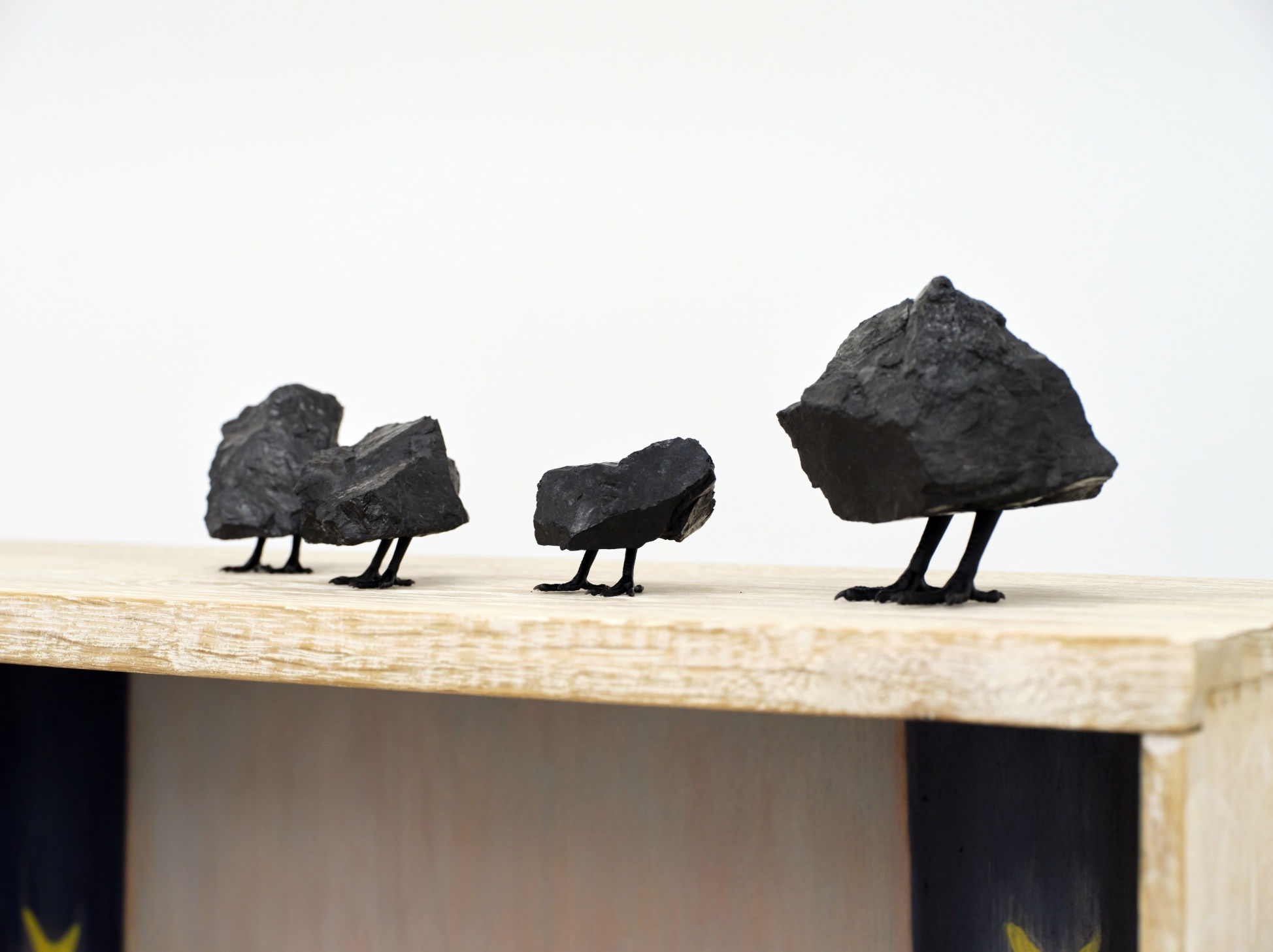 Birds made of coal are scattered on the window ledges, ironically pointing to the countervailing forces of flight and freedom. Coal symbolizes the heaviness of being on the ground, tugging at the light, dreamy associations of freedom. The surreal and absurd reverie collides with the simple and common material, like a stone thrown into the water, stirring up a whirlpool of memories.