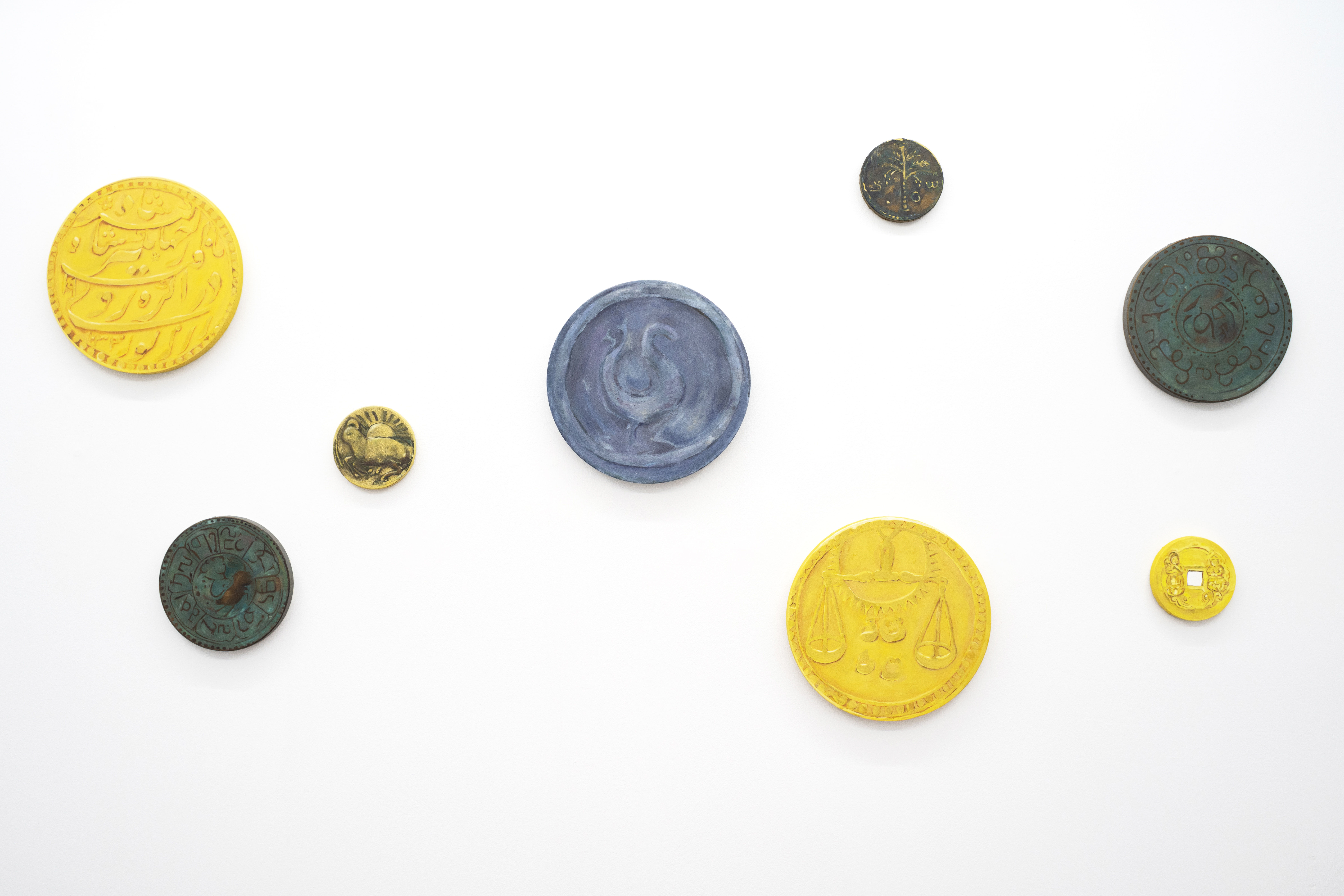 Inspired by her observations of diverse currencies, Mengfan conceived the evocative "Keep the Change" series of paintings. Each artwork within this collection features a medley of currencies sourced from various countries, regions, and governmental entities delicately rendered on circular canvases. Through meticulous juxtaposition on the gallery wall, Bai masterfully recreates the interplay and depth reminiscent of coins nestled within the pool's depths. Symbolically arranged akin to the offerings in a wishing fountain, these amalgamated currencies serve as a poignant reflection of intersecting temporal backgrounds and disparate geographical landscapes, eloquently capturing the essence of interconnectedness amidst diversity.
