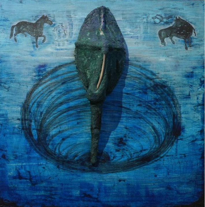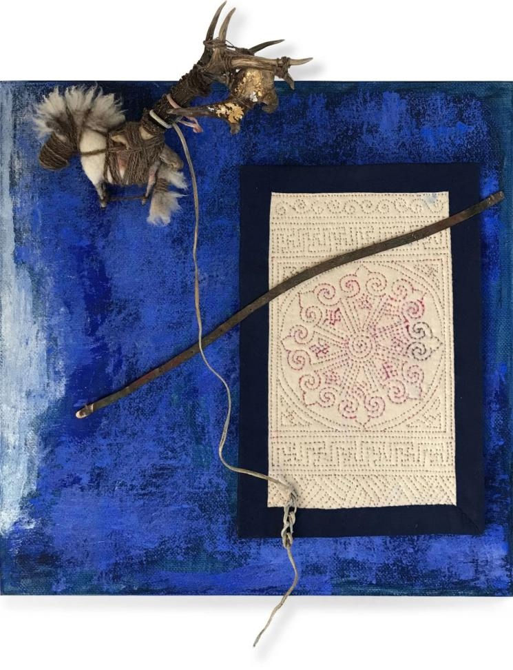 每一幅画的整个呈现可能就是你在某一刻的一整个状态,它不是多重元素的拼贴,更加是一个整体状态的再现。原始材料对您来对您的绘画来说是一种什么样的存在?不只是绘画,包括别的作品中有用到动物骨头,绘画中也出现了牛和马。牛骨、羊骨这一些的就是典型的动物形象介入,这种原始材料的选取,就像你之前说的,「需要的东西就在自己家的柜子里。」人与物的关系在许多原住民文化中都有非常微妙的链接。去年7月我在北海道札幌驻留,驻留期间,我尝试与北海道原住民阿伊努民族的精神信仰与生命认知产生链接。阿伊努民族将周围存在的各样事物中,对人类产生重要影响的神灵称做Kamuy,阿伊努民族相信Kamuy存在于万物之中,时刻守护、帮助人类的生活,人类也需要以美丽的音乐舞蹈、衣物上律动起来的刺绣纹样予以回馈。我对许多阿伊努传统服饰背后,作为神性载体的古老纹样进行学习,由此创作了这件作品的后景。阿伊努人相信,物件在被使用完后,在被弃置之前,需要将其打破,以帮助物件其中的Kamauy回到它本属于的世界。在这件作品的前景中,一艘寿终正寝的木船被打破,木船中的Kamuy通过祭祀仪式与祭祀品(中心的木碗)回到灵界。