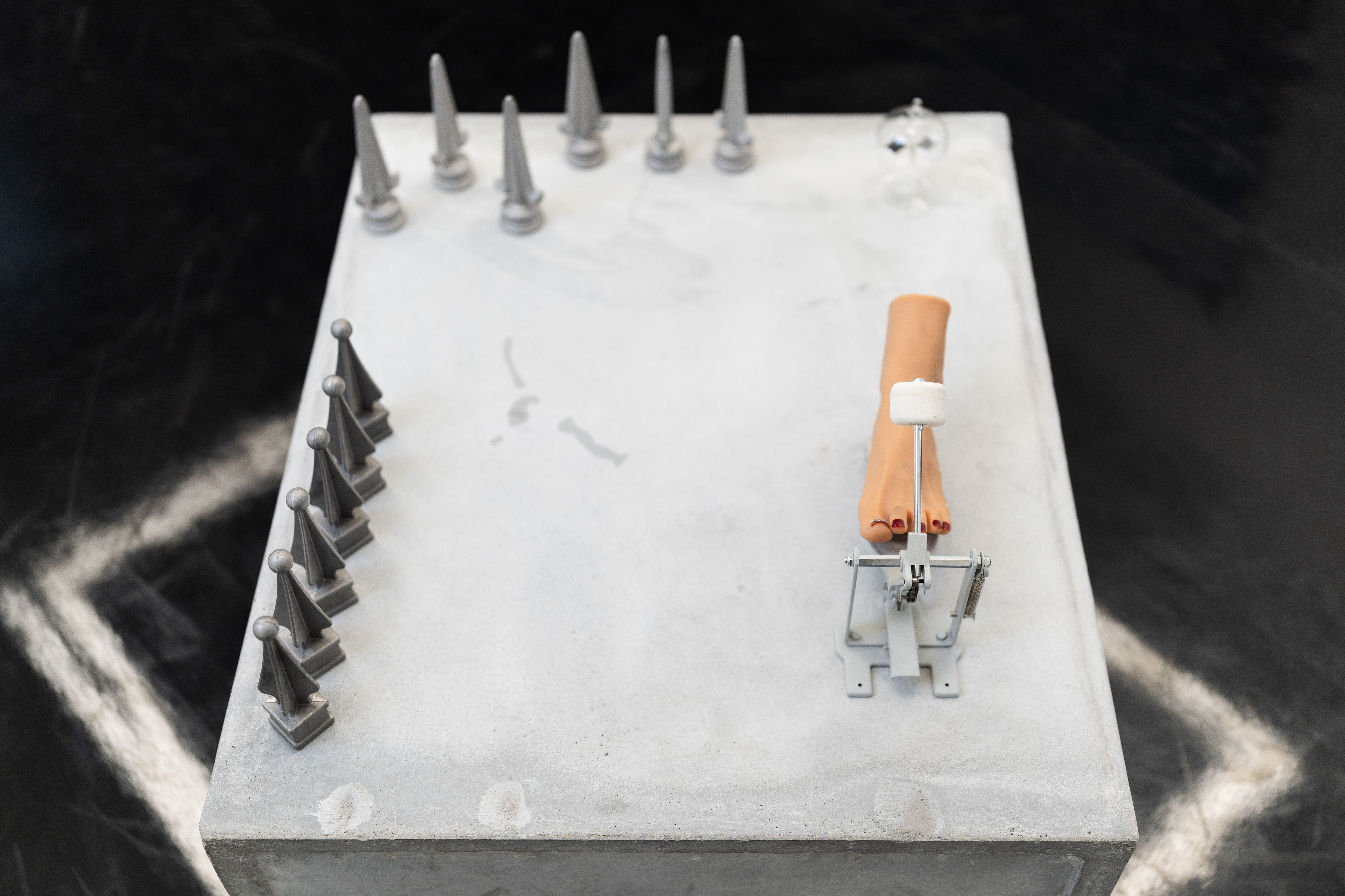 Metal, plastic, silicone model, glass box, cement