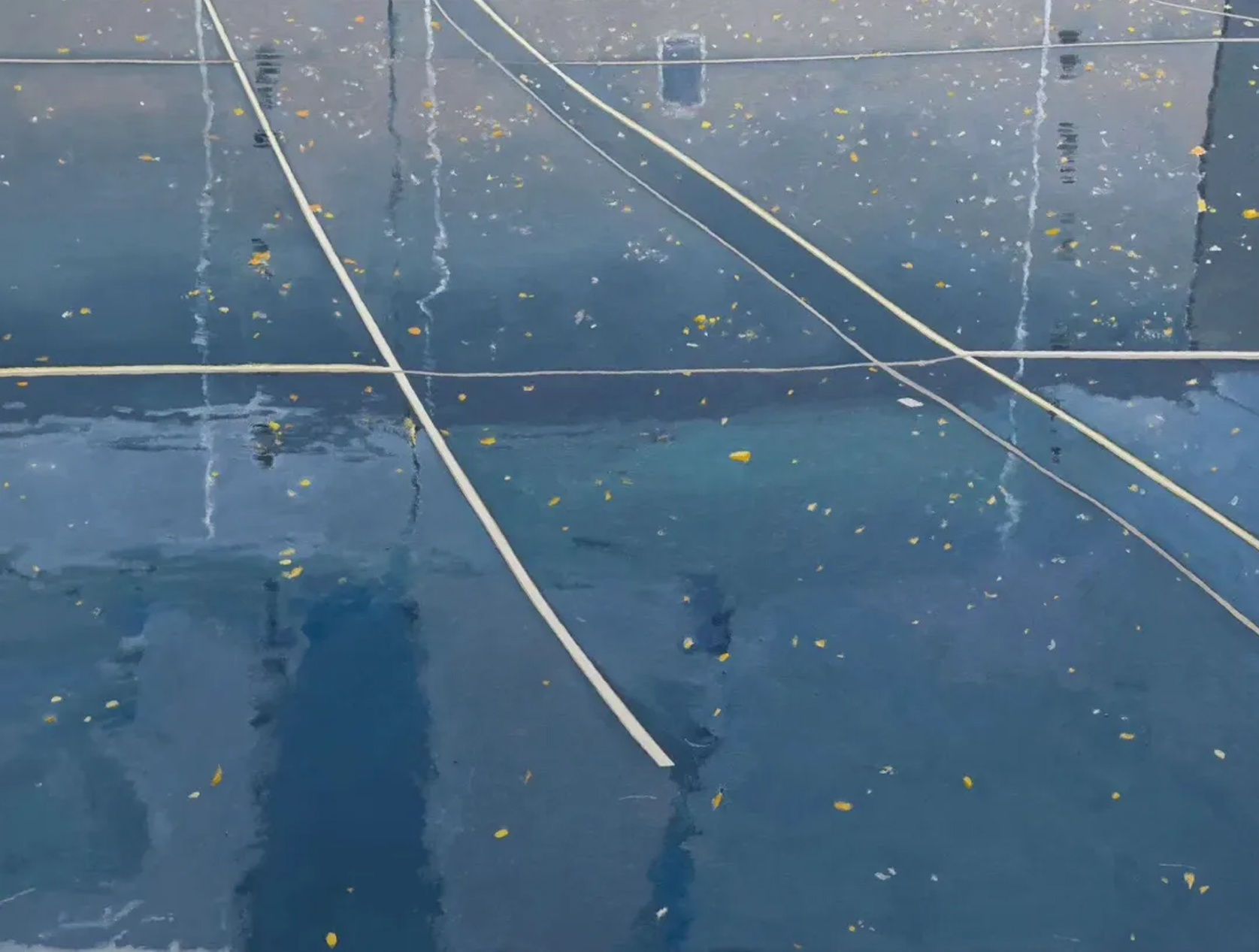 A: Beginning with a series of works depicting tennis courts, shades of blue were used so frequently over a period of time that the later stages of depicting the hard texture of the courts instead brought in a lot of imagery of the waters and the observation and understanding of the varying densities of water patterns in rivers and lakes.