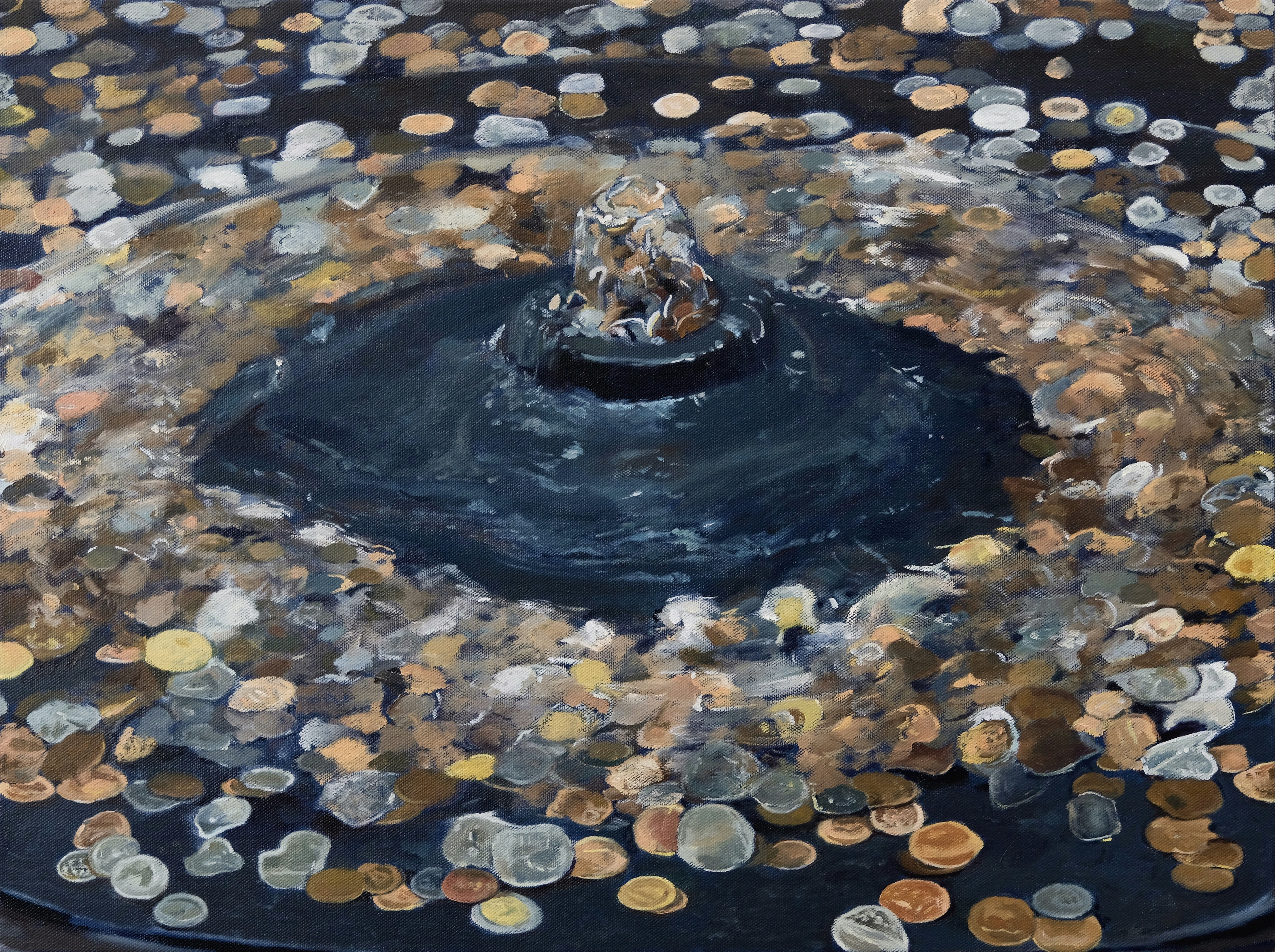 It was in 2021 that I really began to paint "water", at that time, I often had to cross the bridge over the East River from my home to my studio, often passing by its high and low tides; I would also go to the Metropolitan Museum of Art to look at ancient paintings regularly, and when I got tired of looking at them I would sit next to the "Nile River" in the Egyptian pavilion. "The bottom of this man-made pool is often glittering with coins from all over the world, and staff are responsible for salvaging them regularly. The disruption of international travel and political tensions at that time are also directly reflected in the change of coins and the number of coins. The coins left in the pool, intertwined with the reflections of the Egyptian frescoes disrupted by the water, prompted me to think about constancy and circulation.
