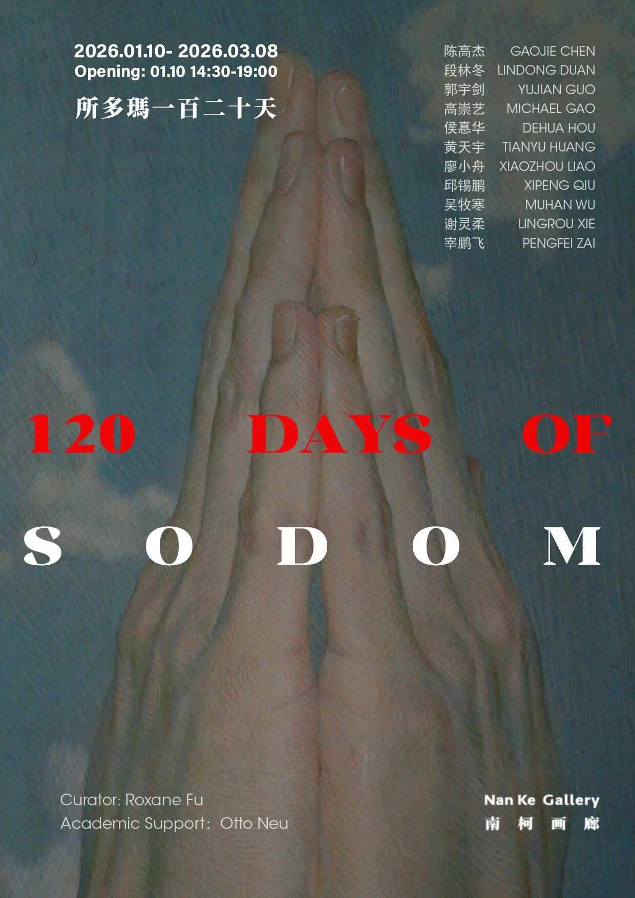 In the exhibition The 120 Days of Sodom, Lindong Duan consistently places the focus of his painting on the hand. In his understanding, the hand and the face are both central to human emotional expression, yet they operate through different mechanisms: facial expressions are direct and outward, while the hand conveys emotion in a more concealed manner, often revealing inner states unconsciously. It is precisely this subtle and easily overlooked quality that draws Duan repeatedly back to the hand as a visual motif.