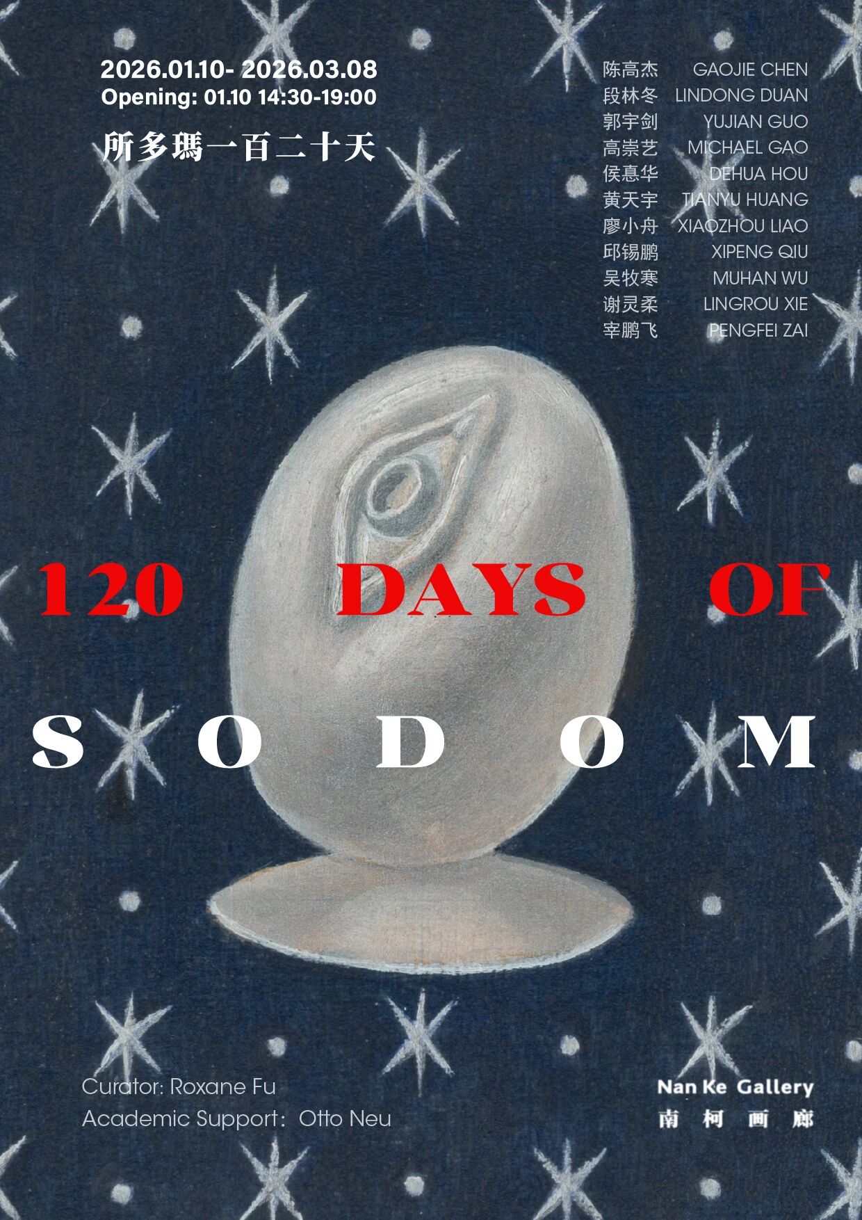 Installation view of 120 Days of Sodom, Jan. 10, 2026 - Mar. 8, 2026, Nan Ke Gallery, Shanghai, ©Courtesy of Nan Ke Gallery, Photographed by Runxin.Gaojie Chen was born in 1993 in Shunchang, Fujian. He graduated in 2015 from the Second Studio of the Oil Painting Department at the China Academy of Art and currently lives and works in Hangzhou. His long-term practice is devoted to constructing painting as a “burning crystal”—a condensed amalgam of life, mythology, and destiny. Confronted with the overwhelming influx of information in the contemporary world and the isolation of individual experience, Chen anchors his practice in images that are at once absurd and enigmatic, casting fragments gathered from lived experience into an ambiguous, high-temperature alchemical furnace where symbols, obsessions, and unstable emotions continue to generate themselves on the canvas.