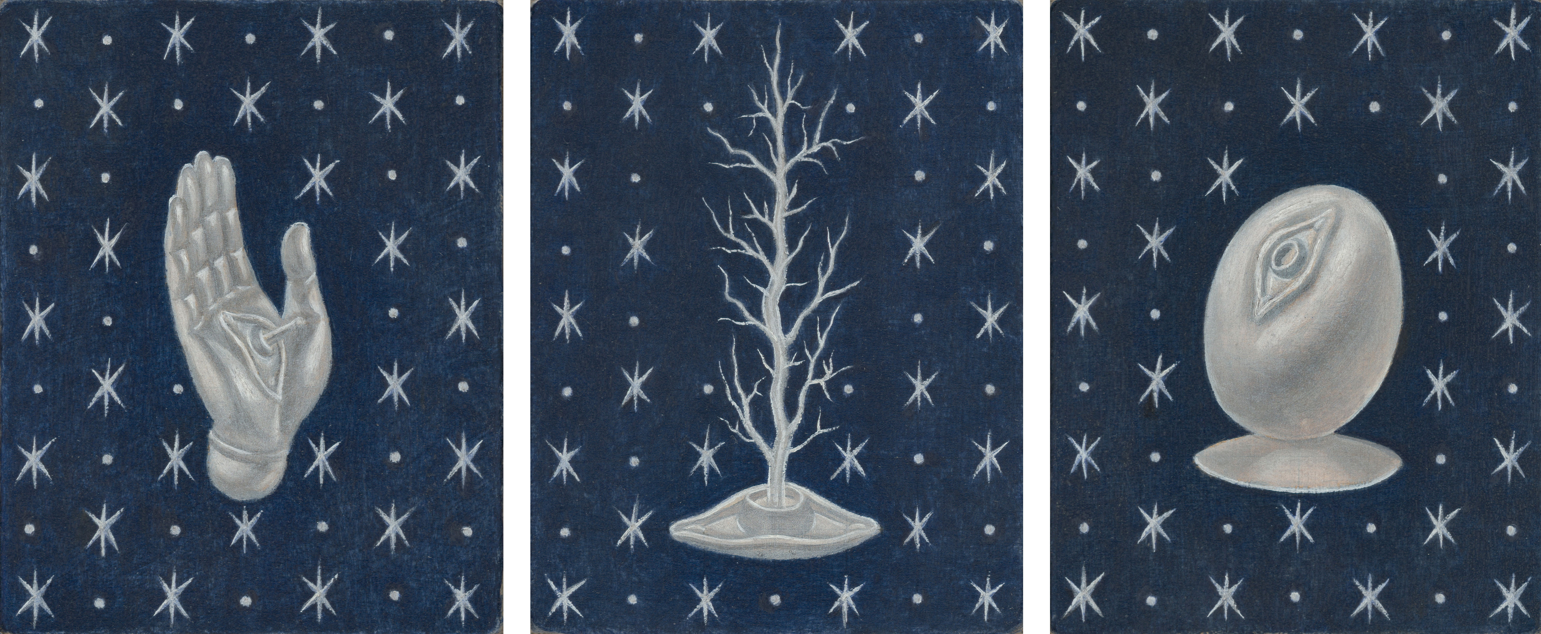 In this exhibition, Chen’s works establish a viewing trajectory that shifts from intimacy to pressure through the juxtaposition of different scales and densities. The small-scale triptych The Bestowing Virtue is set against a background of star-chart motifs imbued with a medieval sensibility, producing a restrained and enclosed sense of time. In the foreground, organs and growing plants appear side by side, compressing internal structures of life and outward proliferation into a tightly limited pictorial field. The result is an almost allegorical space of observation that demands proximity and duration, turning viewing into a slow and introspective act.